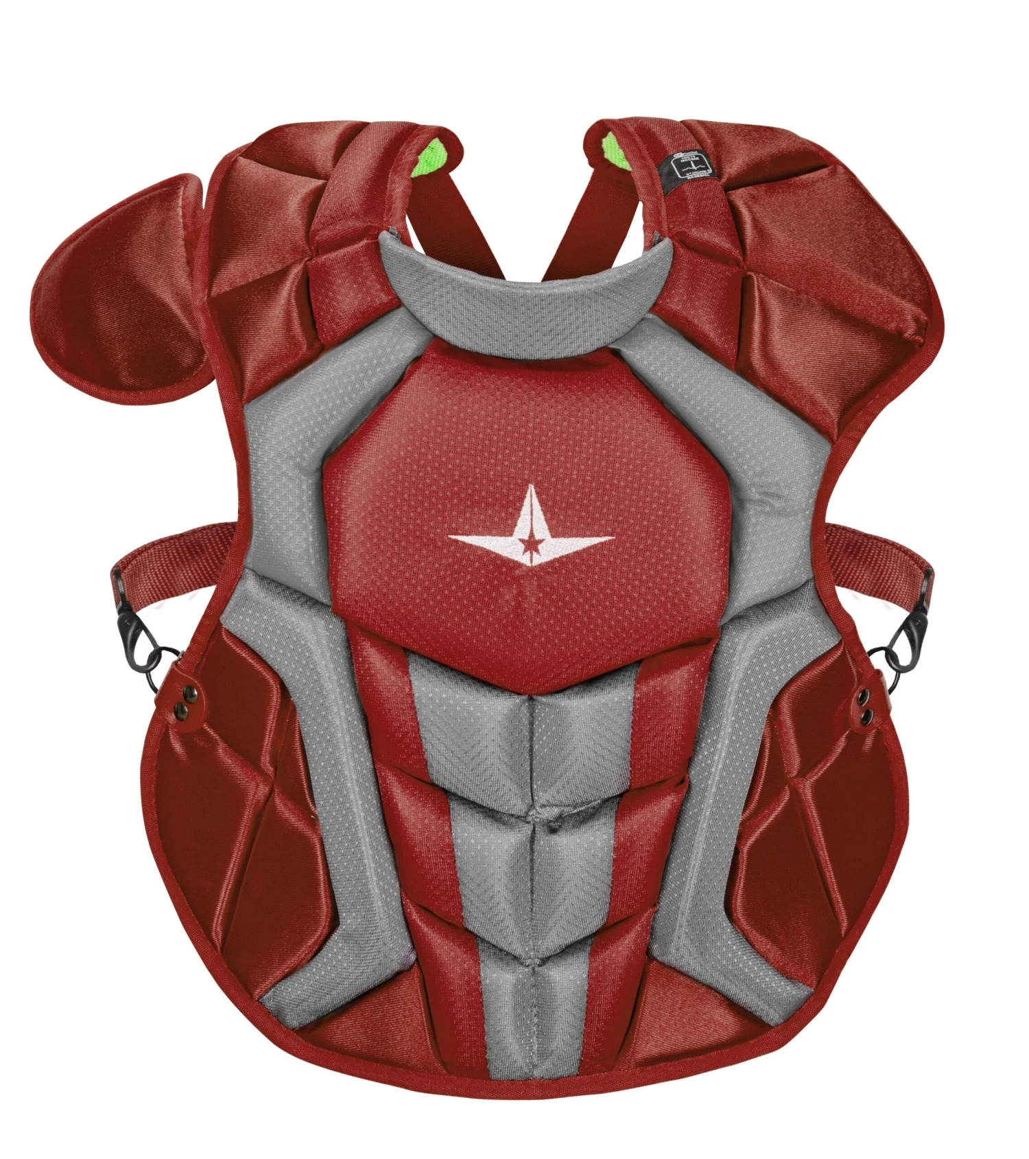 The All Star SEI Certified System 7 Axis Youth Chest Protector CPCC912S7X is a 14.5 defensive juggernaut. It is essentially the same as its slightly larger, 15.5 counterpart. Right down to its headlining features and color options. The upgraded features All Star masterfully incorporates into this protector are: