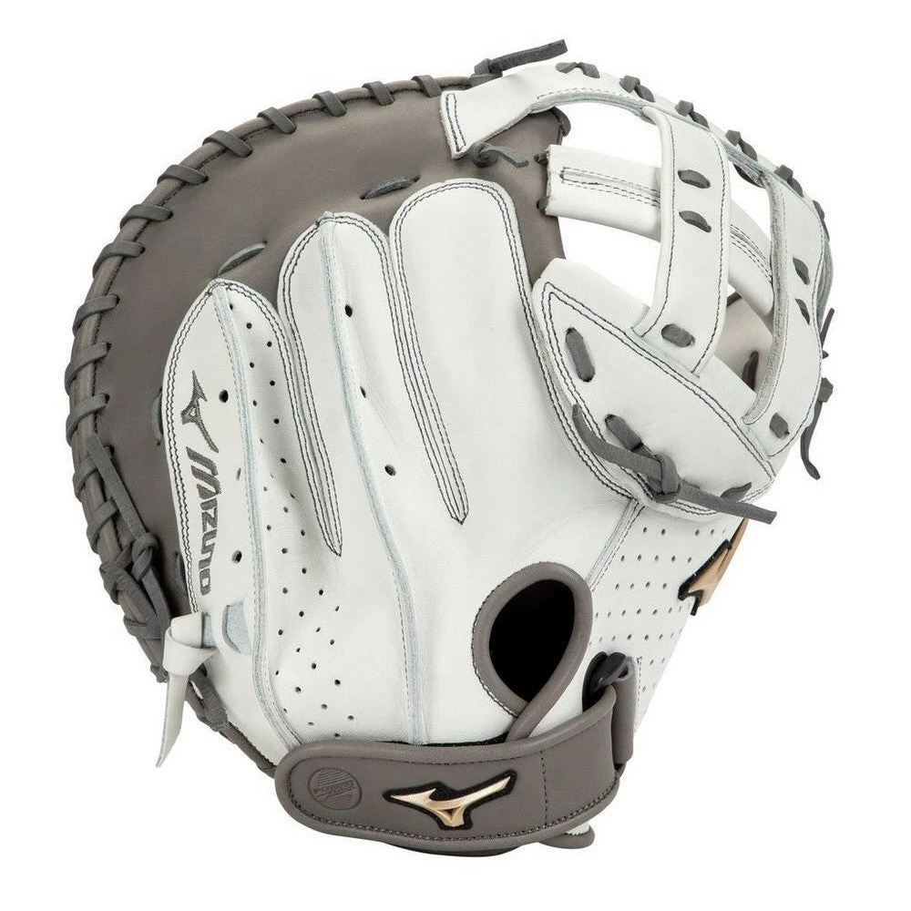 The Mizuno Prime Elite 34 in Fastpitch Catchers Mitt is the perfect fastpitch catcher’s mitt for serious players. When it comes to building the perfect fast pitch softball catcher’s glove Mizuno decided they would try to take the best of both worlds. Some aspects from the past and some from the present. Using soft, smooth white and grey leather the Prime Elite Fastpitch series feels like your favorite gloves of yesteryear with all of the modern attributes that have been developed to help protect and perfect your game. The leather is guaranteed ultra-soft and comes pre-oiled for your convenience in order to reduce break-in time and provide a relaxed, personalized feel that will be retained regardless of use. Power Lock technology installed in the pocket enhances catching ability and stabilizes the key pressure points in the glove responsible for keeping the ball secure while allowing for quick transfers to your throwing hand.